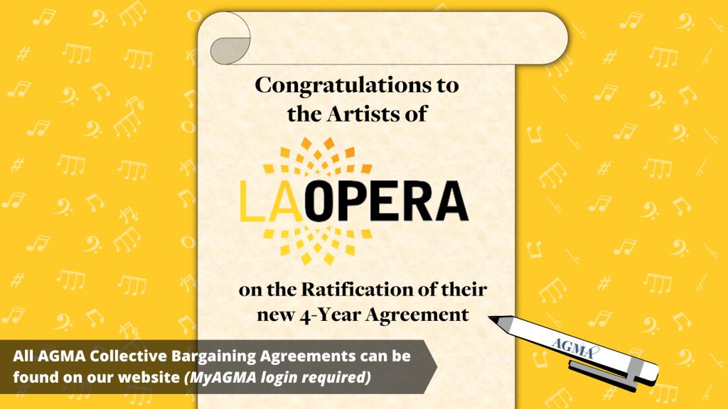 The new collective bargaining agreement between AGMA and Los Angeles Opera was approved by AGMA leadership, after being ratified by the shop.