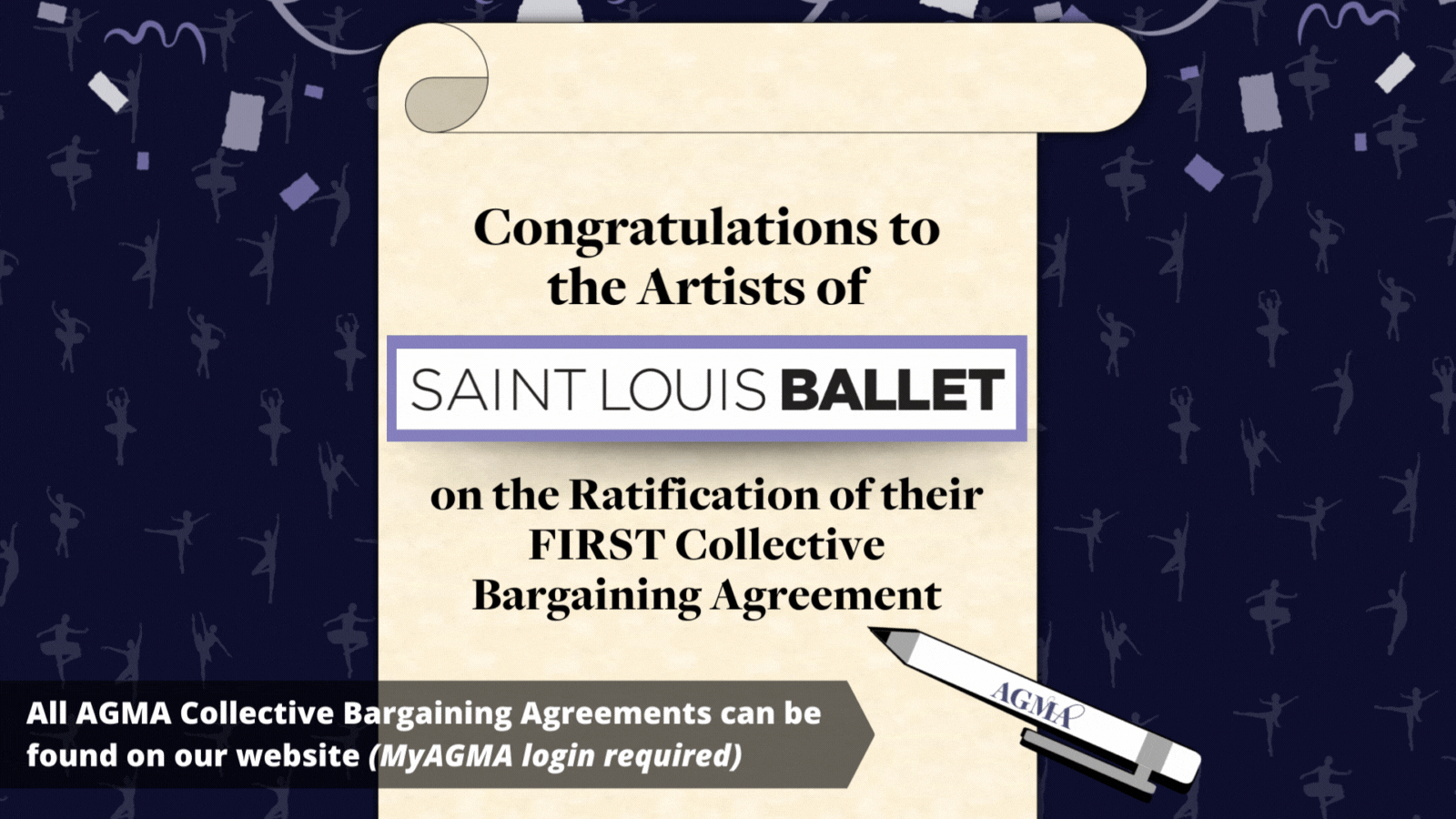 The FIRST collective bargaining agreement between AGMA and Saint Louis Ballet was approved by AGMA leadership on August 12, 2024, after being ratified by the shop.