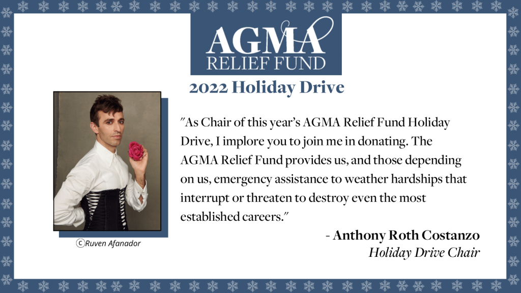 The AGMA Relief Fund has announced countertenor Anthony Roth Costanzo as Chair of this year’s AGMA Relief Fund Holiday Drive. You can read his personal message to friends, colleagues, and supporters of the Arts below or by visiting the AGMA Relief Fund website.