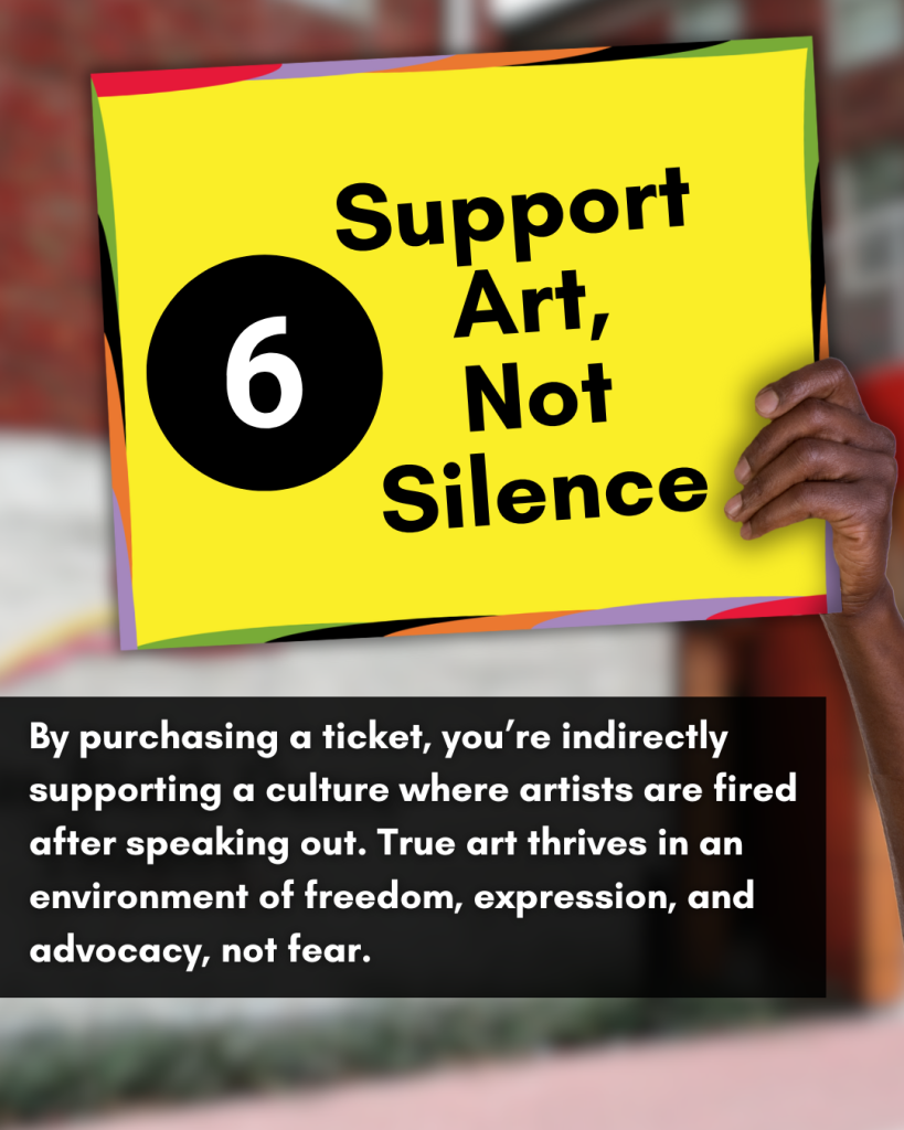 6. Support Art, Not Silence: By purchasing a ticket, you’re indirectly supporting a culture where artists are fired after speaking out. True art thrives in an environment of freedom, expression, and advocacy, not fear.