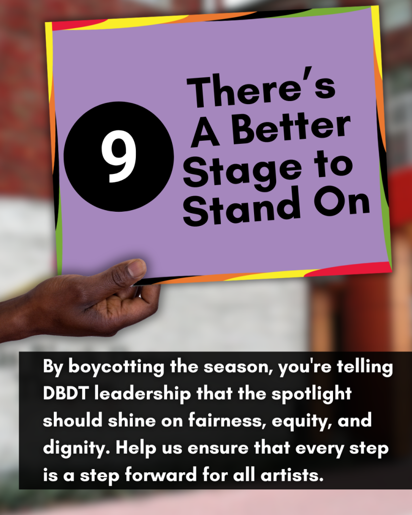 9. There’s a Better Stage to Stand On: By boycotting the season, you’re telling DBDT leadership that the spotlight should shine on fairness, equity, and dignity. Help us ensure that every step is a step forward for all artists.