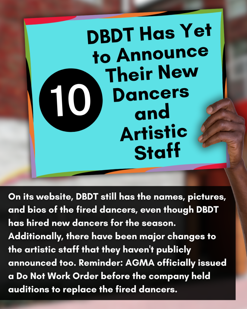 10. DBDT Has Yet to Announce Their New Dancers and Artistic Staff: On its website (as of right now), DBDT still has the names, pictures, and bios of the fired dancers, even though DBDT has hired new dancers for the season. Additionally, there have been major changes to the artistic staff that they haven’t publicly announced too. Reminder: AGMA officially issued a Do Not Work Order before the company held auditions to replace the fired dancers.