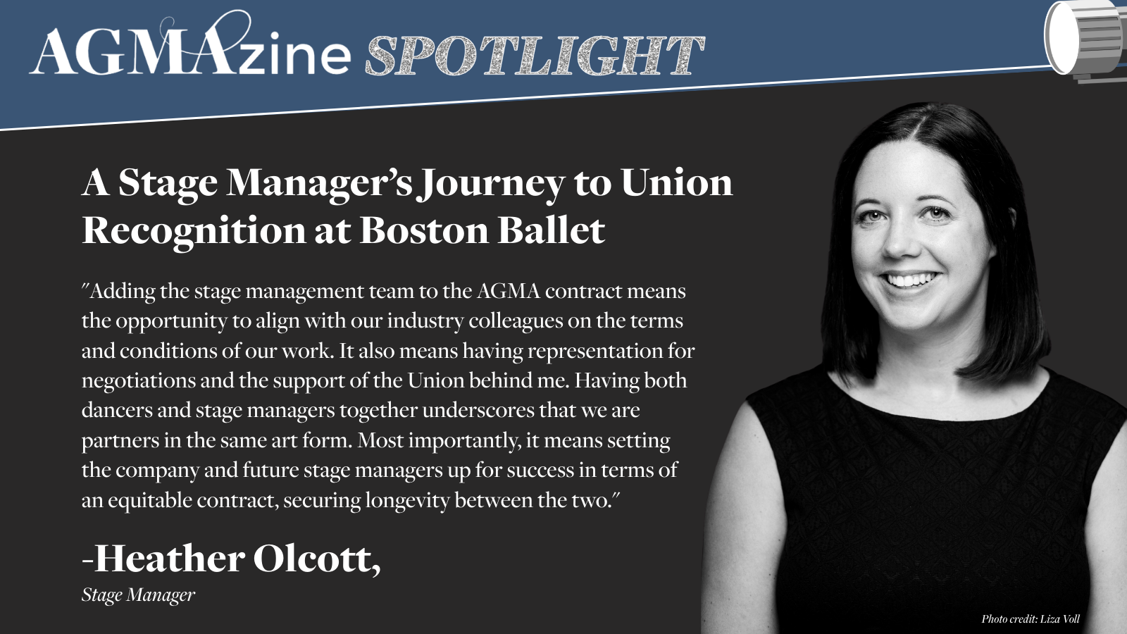 In August 2025, AGMA and Boston Ballet announced the voluntary union recognition of the Company’s Stage Managers. In this reflection, Stage Manager Heather Olcott shares her journey, and becoming a member of AGMA means to her.