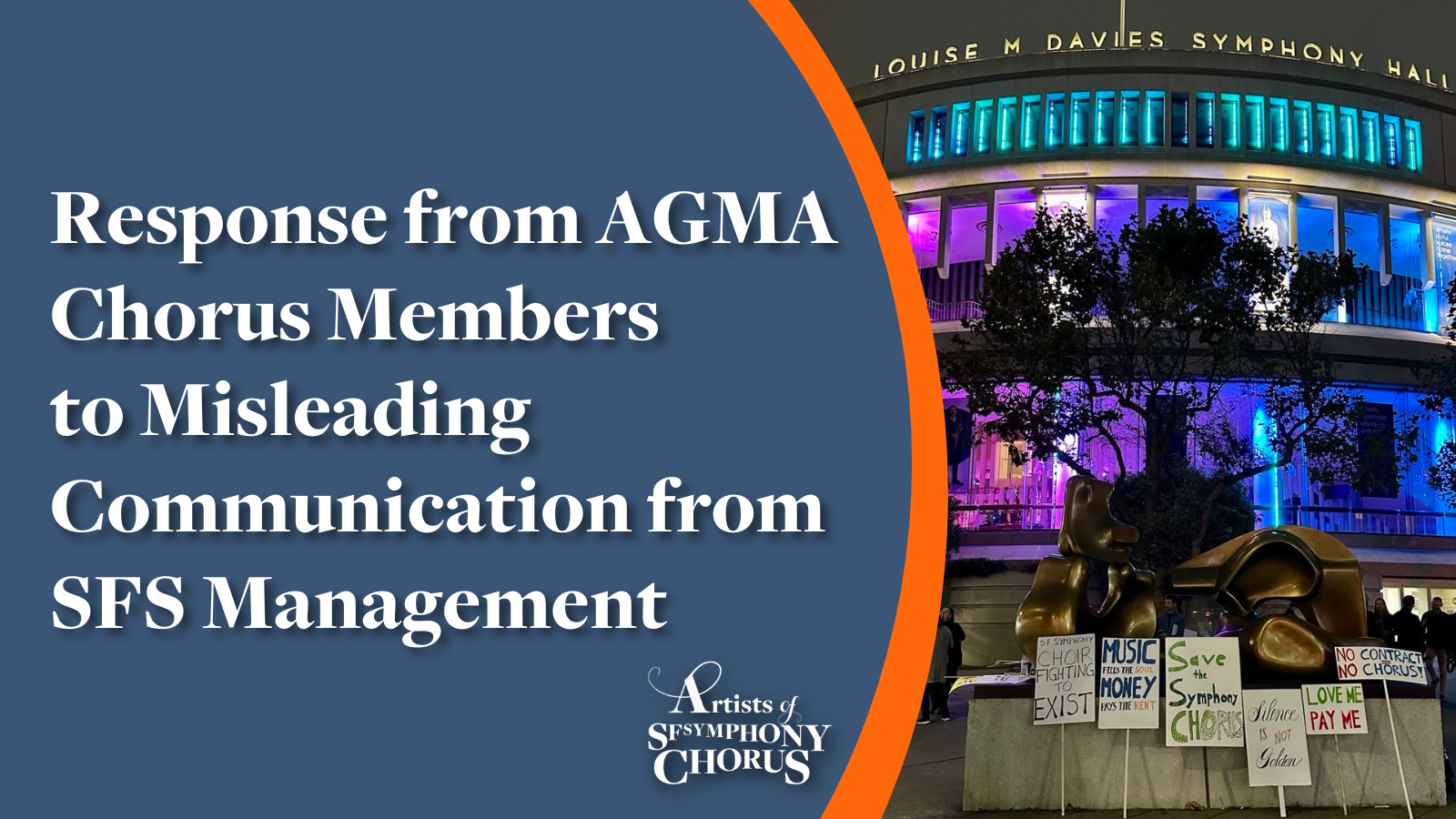 Last night, on November 15, 2024, while the San Francisco Symphony Chorus was warming up for the Fauré Requiem, SFS management sent a misleading email to patrons regarding negotiations between the Symphony and the American Guild of Musical Artists (AGMA) negotiating team and the San Francisco Symphony Chorus.