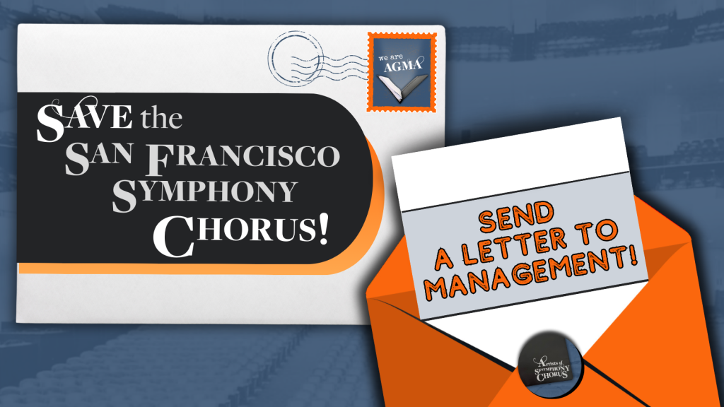 Help us protect these choral jobs and the Arts in the Bay Area. Please send letters to the Symphony’s leadership and Board, asking them to negotiate fairly and keep the choristers’ standards intact. Your support is crucial to ensure the San Francisco Symphony can continue to thrive as a world-class organization without losing the talent and dedication that have brought the Symphony international renown, soaring ticket sales, donations contributing to its enormous endowment, EIGHT GRAMMY AWARDS as well as dozens of nominations, and joy to so many. Together, we can Save the Chorus!