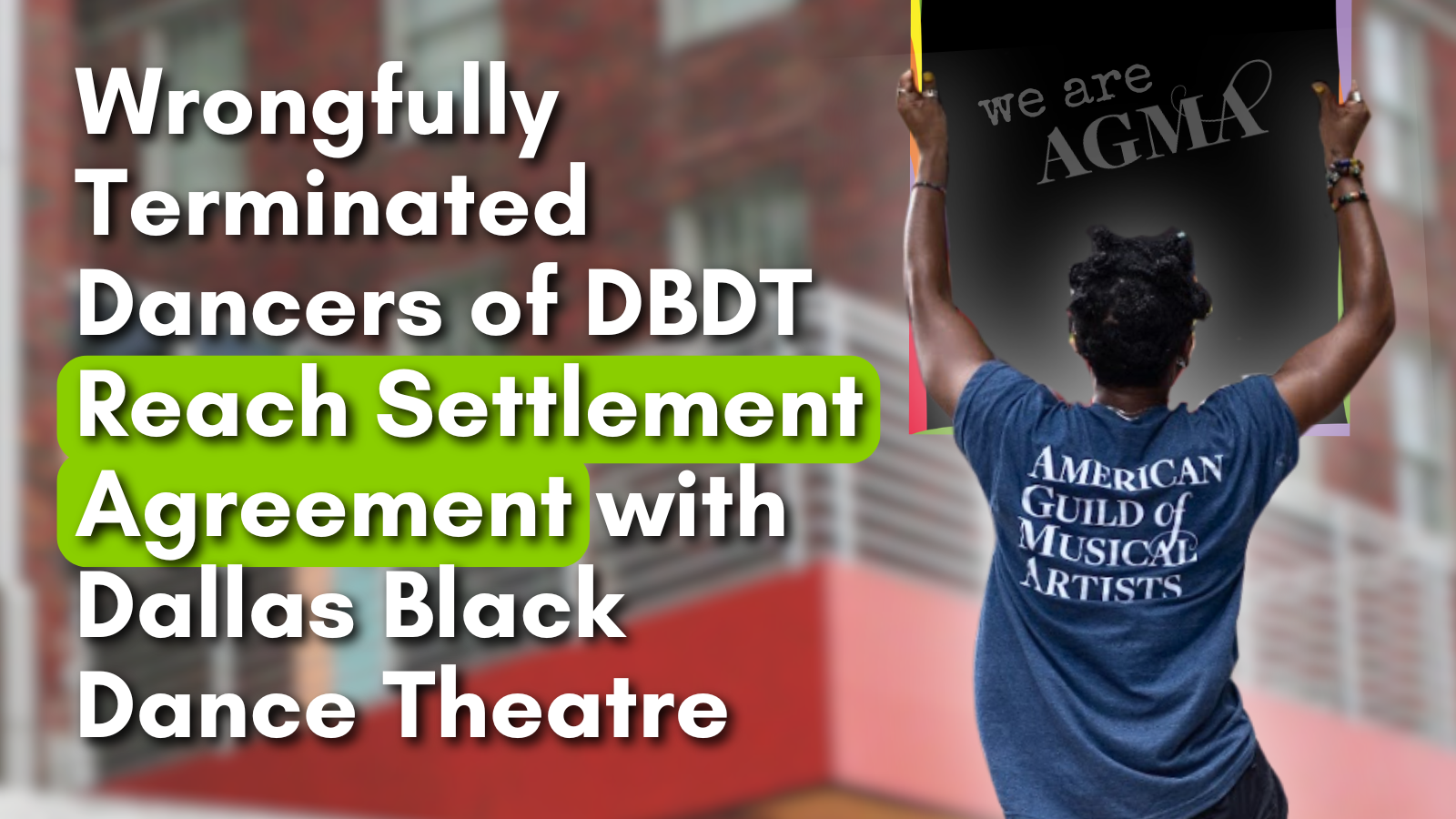 “AGMA and the dancers extend heartfelt thanks to the hundreds of supporters who rallied, raised their voices in unified chants, and stood with us on each of our picket lines, going back to our first rally in August,” said National Organizing Director Griff Braun. “Together, we’ve shown that misuse of power in the Arts can be confronted by the artists themselves, standing in solidarity with all working people. This settlement provides a measure of tangible justice for the fired dancers of Dallas Black Dance Theatre. Let us hope that, going forward, DBDT will take stock of itself and its actions and make the leadership and structural changes necessary to make it an arts organization of which the city of Dallas can truly be proud.”